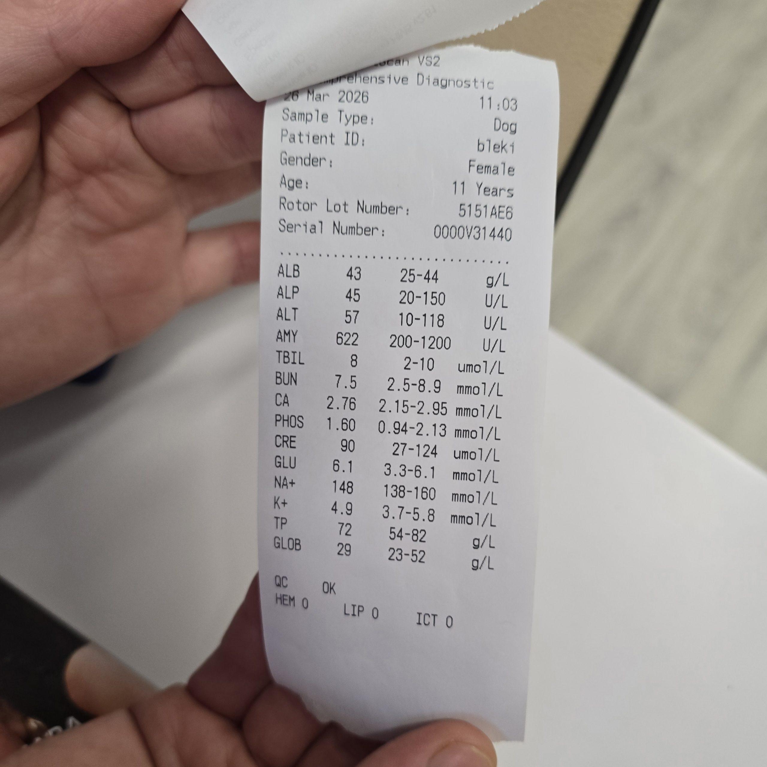 Izvidi so bili brez posebnosti, veterinarka pa je rekla, da so za njena leta izjemno dobri. Vsi parametri so bili v mejah normale. Ampak jaz tega ne dojemam kot “glede na starost”. Jaz to vidim kot rezultat.