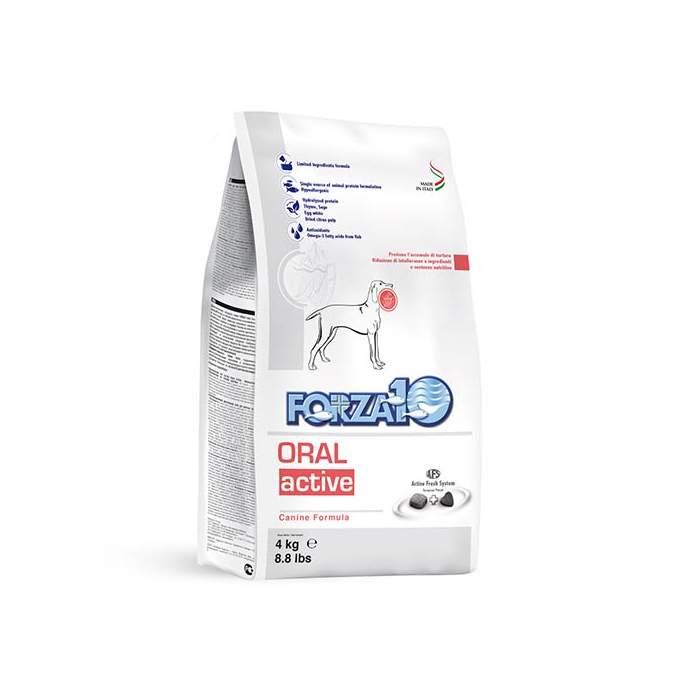 Forza10 Oral Active je ustvarjena posebej za pse, ki imajo težave z zobmi in ustno votlino. Primerna je tudi za alergike, saj je hipoalergena in temelji na enem viru beljakovin (pelagične ribe). Preprečuje nalaganje zobnega kamna, vnetje dlesni in druge pogoste težave povezane z zobmi in ustno votlino.