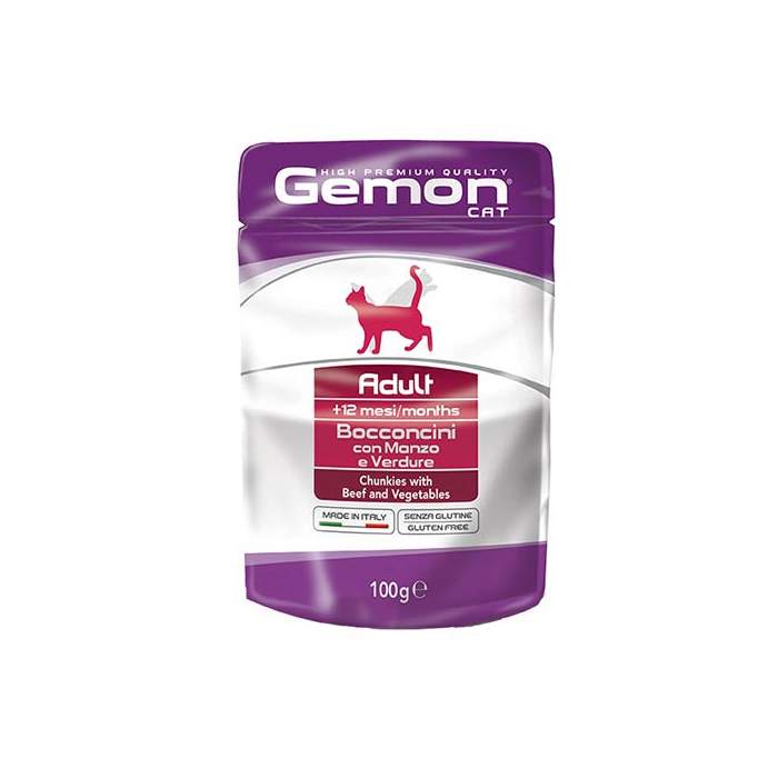 Gemon Cat Adult z govedino in zelenjavo je popolna mokra hrana za odrasle mačke po dopolnjenem 12. mesecu starosti. Recepturi so dodani vitamini in minerali. Vsebuje tudi tavrin, ki ga mačji organizem nujno potrebuje za pravilno delovanje srca, živčevja, prebavnega trakta in imunskega sistema. Vse sestavine so skrbno pripravljene v pečici. Brez gensko spremenjenih organizmov, barvil in konzervansov. Receptura je brez glutena.
