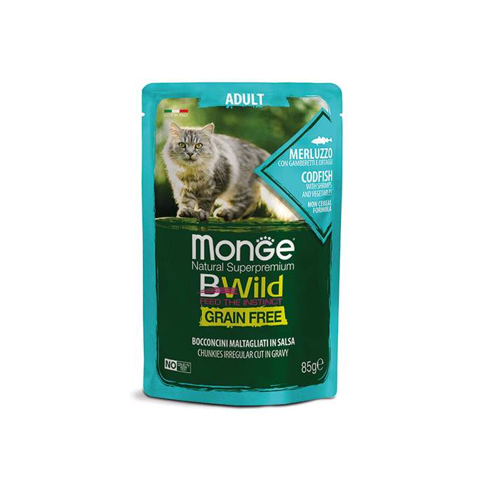 Monge Bwild je popolna in uravnotežena hrana za odrasle mačke. Hrana s polenovko, kozicami in zelenjavo (zeleni fižol in korenje) je posebej oblikovana za dobro počutje vaše mačke, saj ne vsebuje žit. Recept je obogaten z najnovejšimi prebiotičnimi kulturami in izvlečkom juke, ki blagodejno vplivajo na prebavni trakt. Dodani vitamini in minerali poskrbijo za zdravje in dobro počutje vaše mačje ljubljenke.