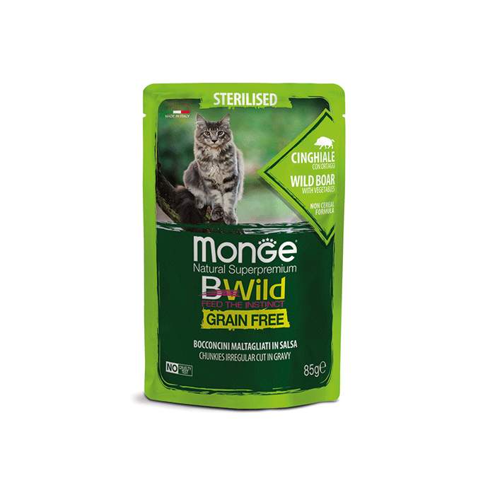 Monge Bwild je popolna in uravnotežena hrana za sterilizirane odrasle mačke. Hrana z divjim merjascem, zelenim fižolom in korenjem je posebej oblikovana za dobro počutje vaše mačke, saj ne vsebuje žit. Recept je obogaten z najnovejšimi prebiotičnimi kulturami in izvlečkom juke, ki blagodejno vplivajo na prebavni trakt. Dodani vitamini in minerali poskrbijo za zdravje in dobro počutje vaše mačje ljubljenke.