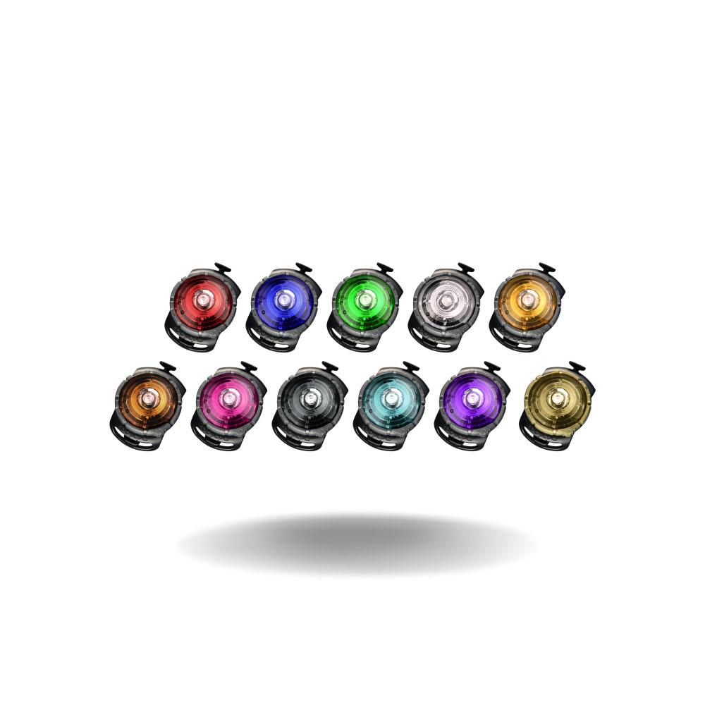 Z vrtenjem obroča izbereš način delovanja (stalno ali utripanje). Namestiš lučko na izbrano opremo psa in preveriš, da je pravilno pritrjena.