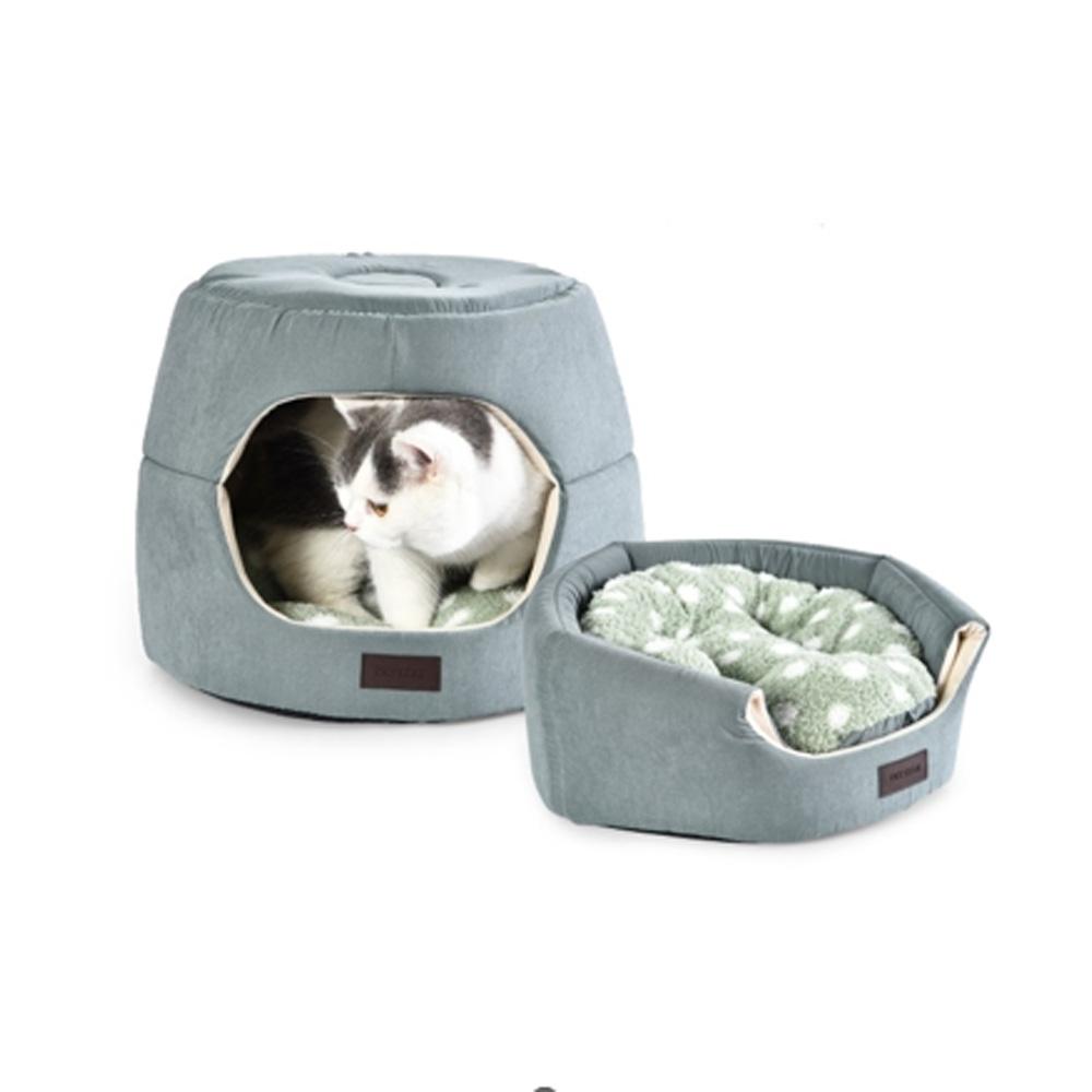 Posteljo postavi na miren kotiček, kjer se mačka počuti varno. Če želiš zaprto hiško, uporabi zgornji del, če pa želiš odprto ležišče, ga enostavno odstrani. Peri pri 40 °C brez mehčalca in suši na zraku.